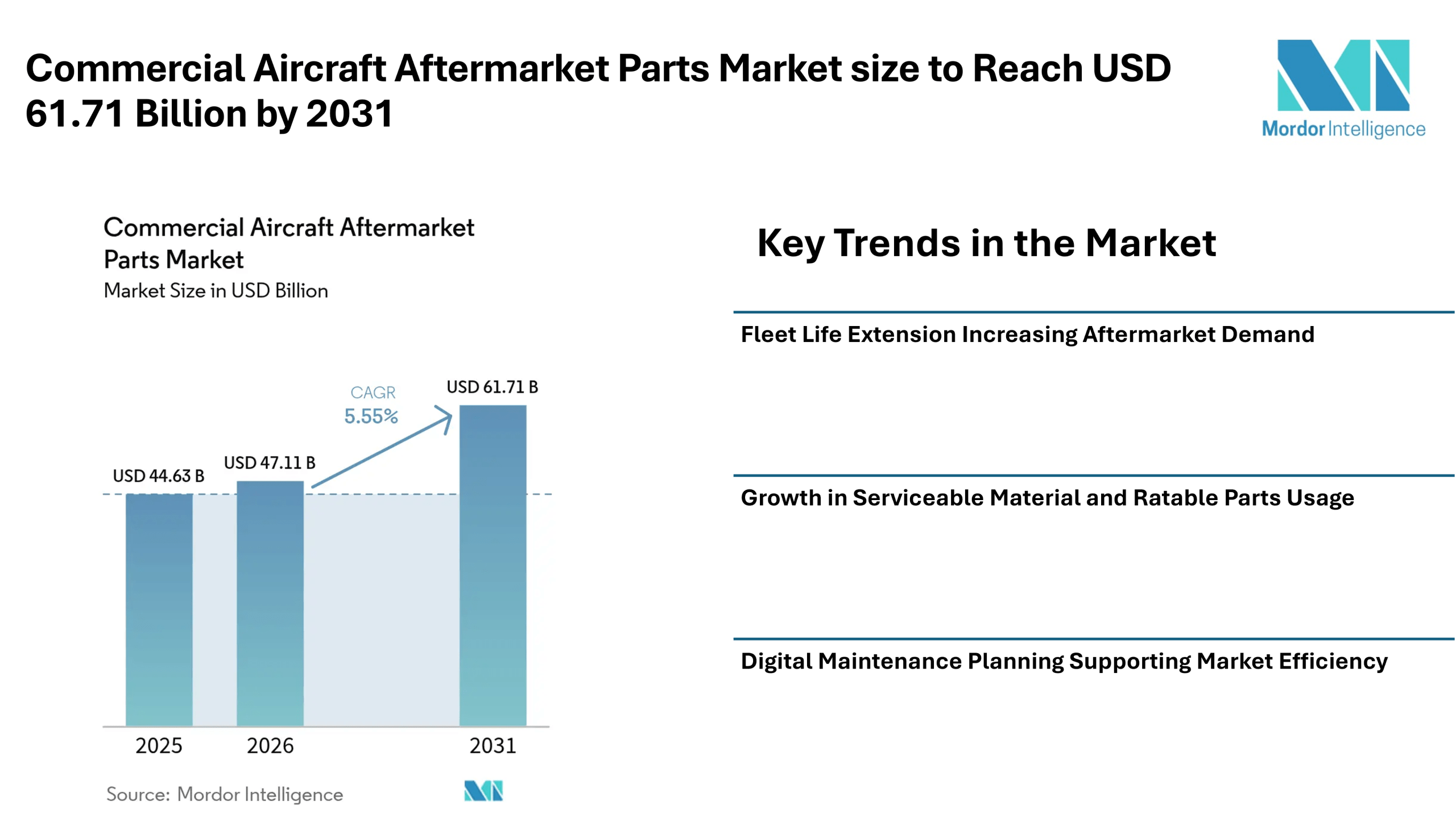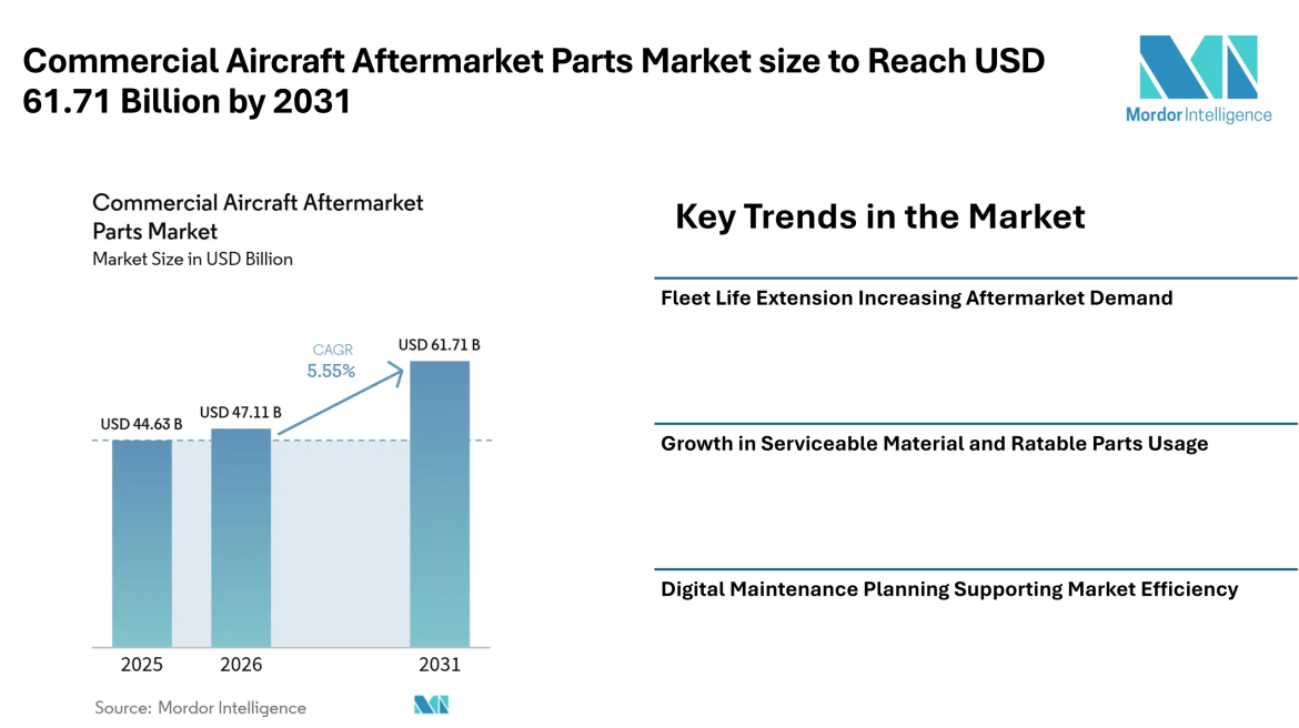 Home Press ReleasesCommercial Aircraft Aftermarket Parts Market size to Reach USD 61.71 Billion by 2031 as Fleet Life Extension and Predictive Maintenance Influence Market Trends – Mordor Intelligence
