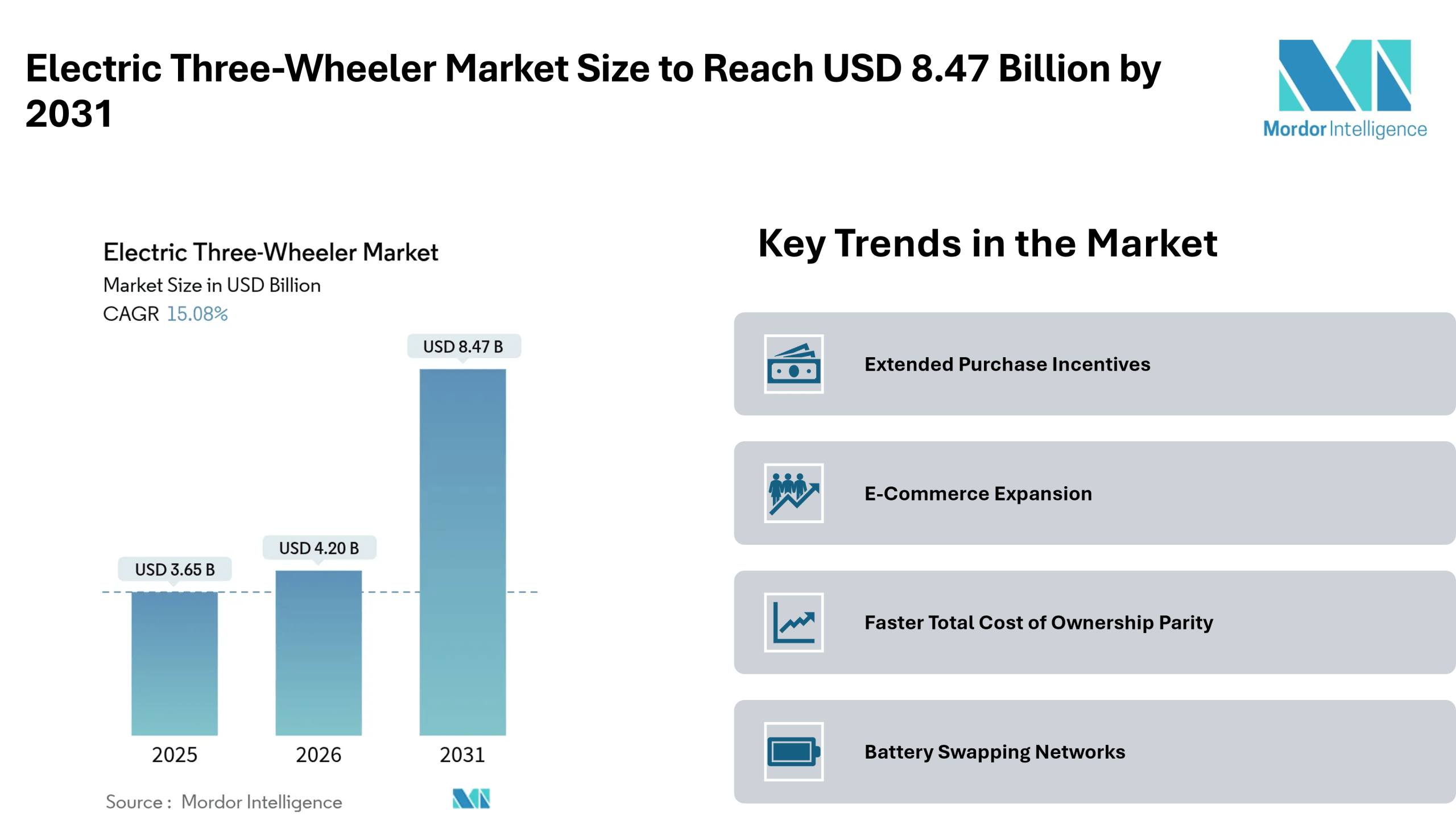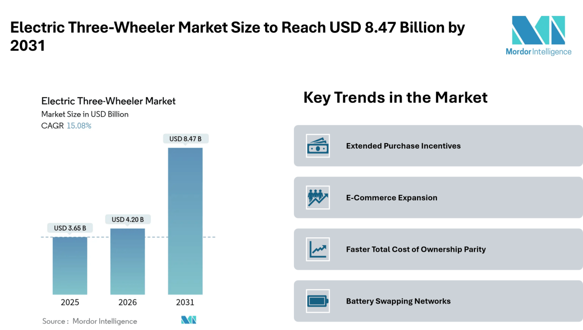 Home Press ReleasesElectric Three-Wheeler Market Size to Reach USD 8.47 Billion by 2031, Amid Expanding Fleet Demand and Battery Swapping Adoption- Mordor Intelligence
