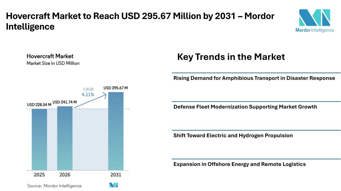 Home Press ReleasesHovercraft Market to Reach USD 295.67 Million by 2031 with Steady CAGR, Driven by Defense Demand, Electric Propulsion, and Flood Response Applications – Mordor Intelligence