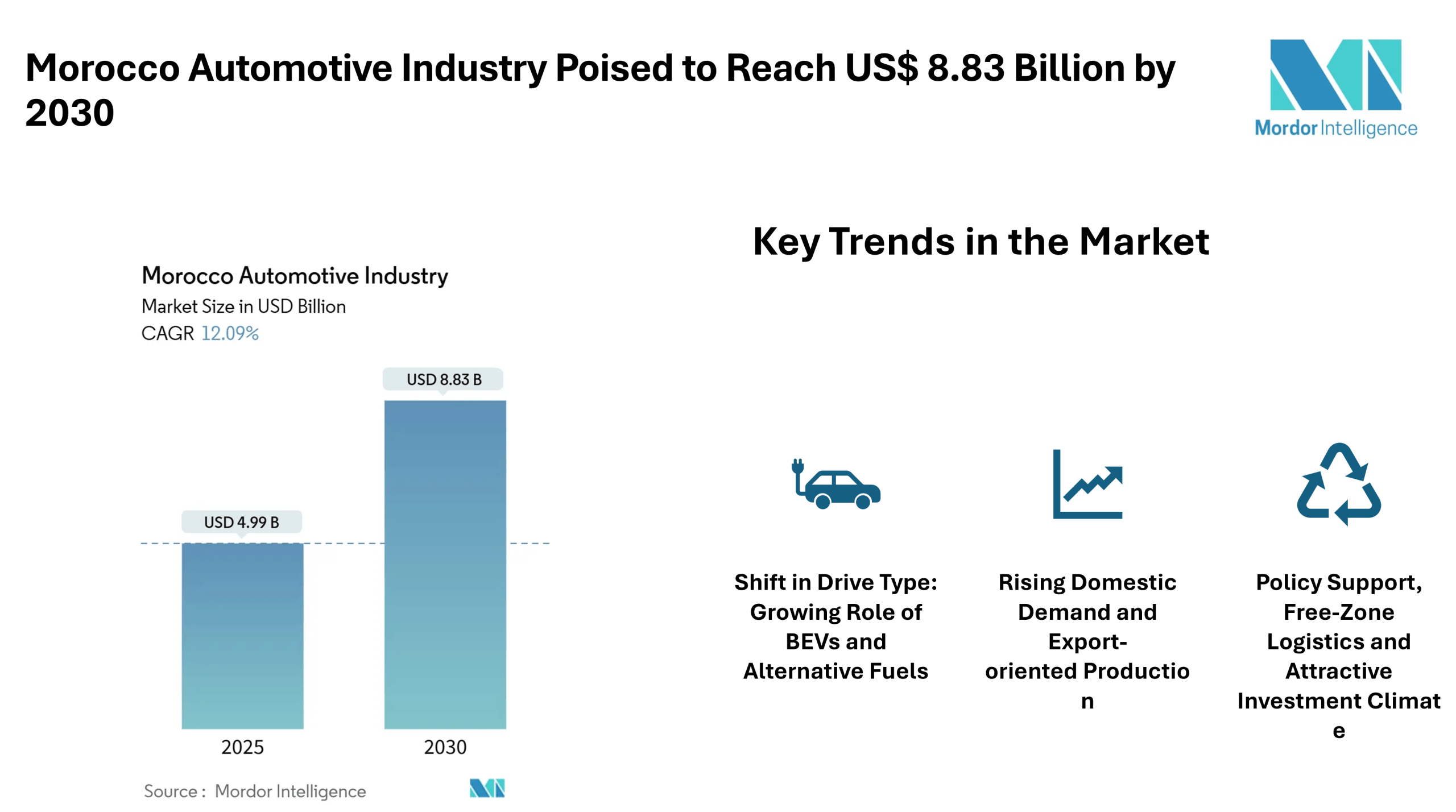 The morocco automotive industry is entering a phase of robust expansion and transformation. From a base value of US$ 4.99 billion in 2025 to a projected US$ 8.83 billion by 2030, the growth is driven by strong passenger vehicle demand, increasing commercial-vehicle demand, rising interest in electric and alternative-fuel vehicles, and a supportive policy and manufacturing environment. The industry’s segmentation across vehicle types, drive systems, fuel types, end-uses, and regions shows balanced diversification. With an established base of OEMs, a growing supplier ecosystem, and the inflow of battery- and EV-related investment, the morocco automotive industry is well-positioned to serve both European export markets and meet future global automotive trends. As Morocco continues to build capacity and invest in infrastructure and skills, the automotive sector is likely to remain one of the most significant contributors to the country’s industrial output, export revenue, and economic growth.