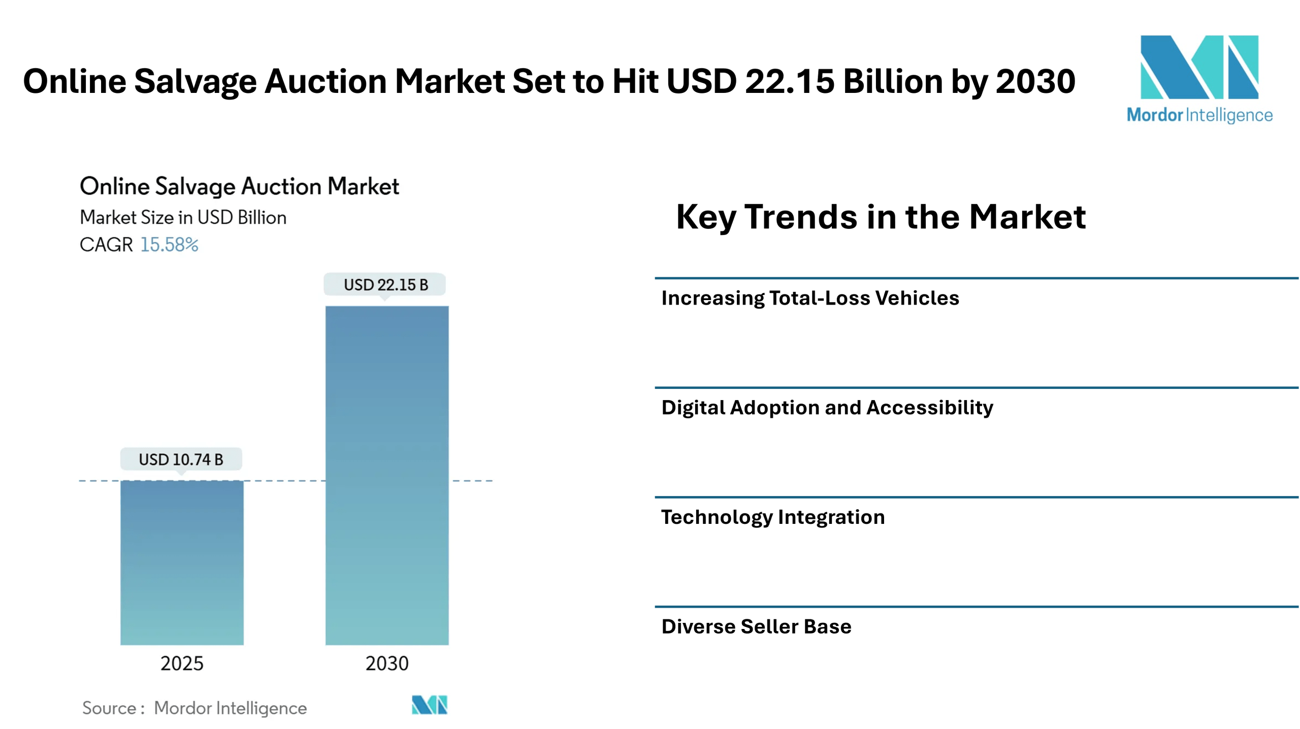 Home Press ReleasesOnline Salvage Auction Market Set to Hit USD 22.15 Billion by 2030, Driven by Digital Platforms and Rising Total-Loss Vehicle Volumes – Mordor Intelligence