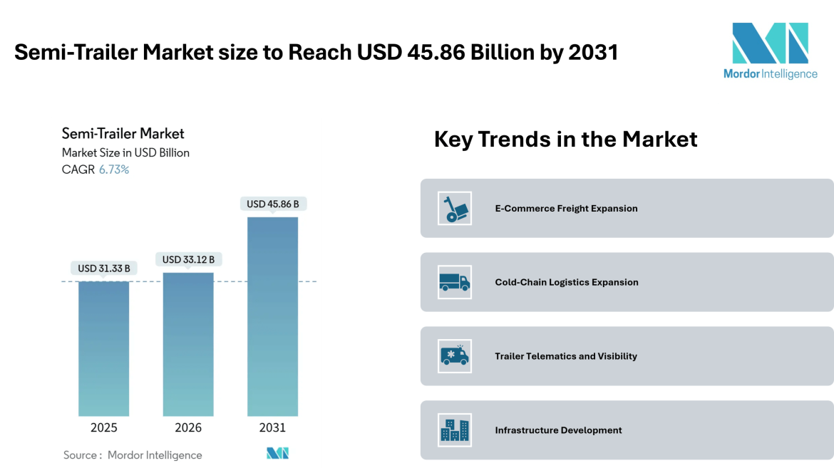 According to Mordor Intelligence, the semi-trailer market size is projected to grow from USD 33.12 billion in 2026 to USD 45.86 billion by 2031, reflecting steady semi-trailer market growth during the forecast period. The semi-trailer market forecast highlights sustained demand across logistics, cold-chain transportation, and infrastructure-linked freight movement.